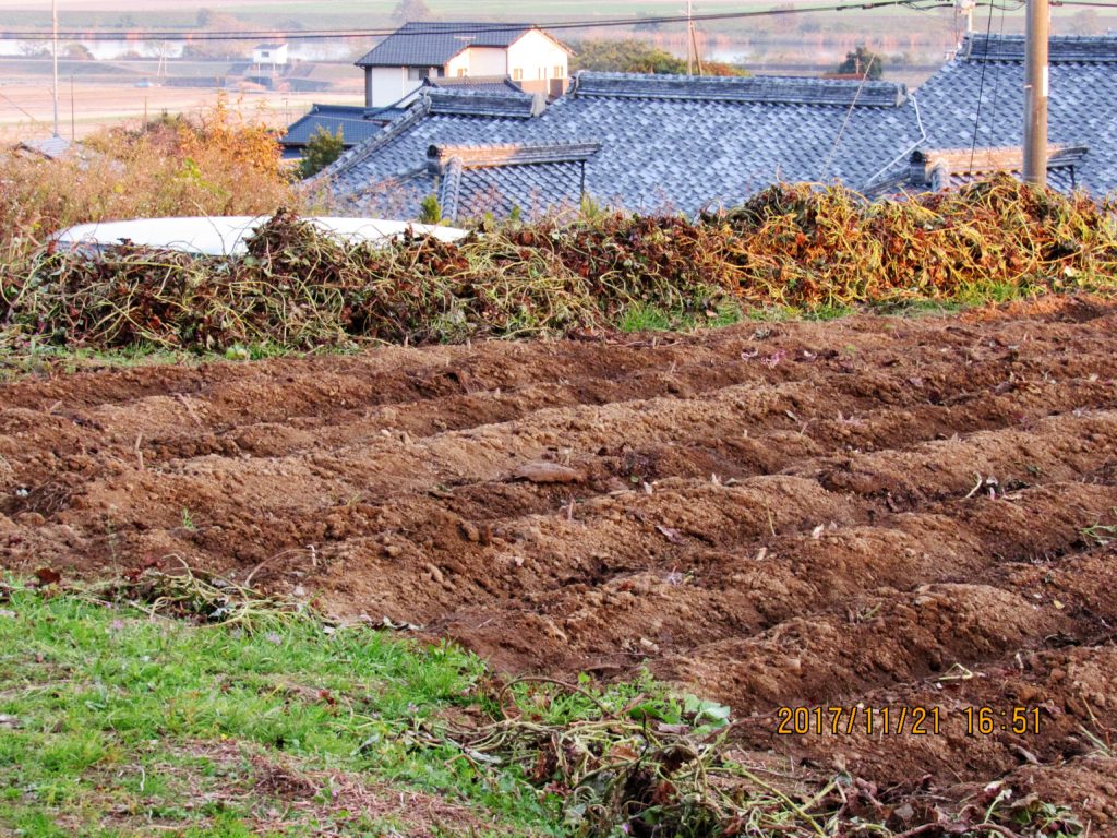 今日は、朝から晴天です。土・日と芋蔓切りの後の作業、蔓寄せとマルチ剥し作業をしました。剥すときに安納芋が所どころ見えました。程よい大きさになっています。明日は、天気予報は朝から雨と言う事で、収穫が出来ません。23日からの収穫作業となります。