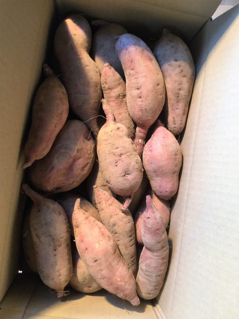 今日の朝も冷え込んだけど、日中は日差しも出て、芋の箱詰めも順調にできた。今日は5kを24箱詰めた。明日から順次出荷である。まあまあの形である。寒さに弱いので温度管理が難しく、怠るとすぐに腐ってしまうので大変です。