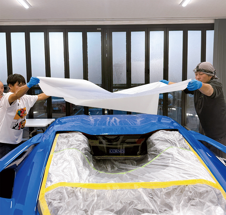 特殊なフォルムのボディに貼る、数日間におよぶ作業。外側からは見えない箇所も道具を使って丁寧に仕上げます。
