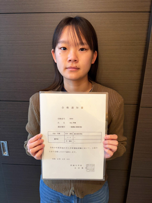 私が本格的に受験勉強を始めたのは、部活動の県大会が終わった6月です。宍戸先生に教わったように、まずは使う参考書を決め、それを繰り返し取り組むことを意識しました。分からないところは動画で確認したり、塾の友達や先生に質問したりしながら、一つ一つ理解を深めていきました。そうした積み重ねのおかげで、本番の共通テストでは大きく崩れることなく、自分の力を最大限発揮することができました。また、二次試験でも落ち着いて問題に取り組むことができました。