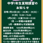 2025年7月11日 / 最終更新日時 : 2025年7月11日 sato お知らせ <夏休み前のお知らせ③中学1年・2年の夏期講習実施します!> 今年度より以前同様中学1年・2年の夏期講習を実施します。 当塾の夏期講習は通常授業をやりつつ➕αで実力をつける形式✨ またこの夏期講習中に通常授業に参加・体験頂けます。 8月10日(日)には新 […]